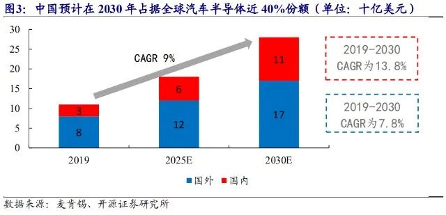 此外,根據(jù)麥肯錫數(shù)據(jù),2019年國內(nèi)汽車半導(dǎo)體占據(jù)全球半導(dǎo)體市場份額的27%(國內(nèi)/國外分別為30/80億美元),預(yù)計(jì)2030年將提升至40%(國內(nèi)/國外分別為110/170億美元),2019-2030年國內(nèi)外汽車半導(dǎo)體復(fù)合增速分別為13.8%、7.8%,國內(nèi)汽車半導(dǎo)體增速顯著高于國外。在行業(yè)“缺芯”事件以及智能化升級的趨勢下,進(jìn)口替代趨勢將加速,國內(nèi)千億車載半導(dǎo)體市場未來可期。